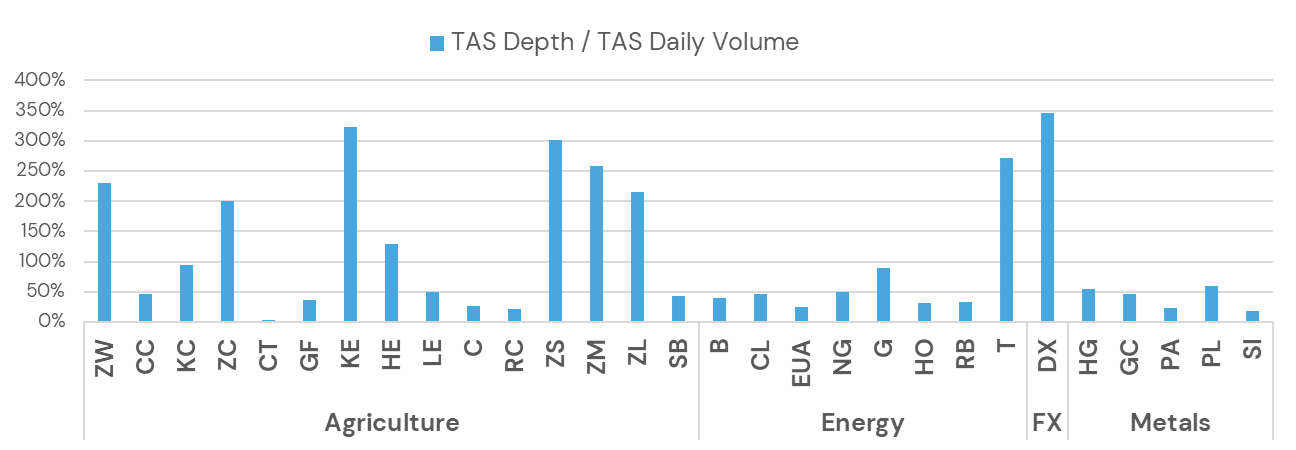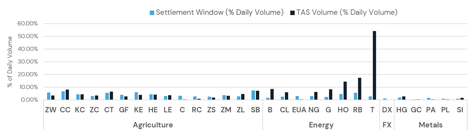 The case for using TAS is particularly compelling in energy markets where TAS liquidity is most plentiful. But in most agriculture and metals contracts, TAS also contributes meaningful liquidity, with volumes comparable to those in the settlement window or higher.