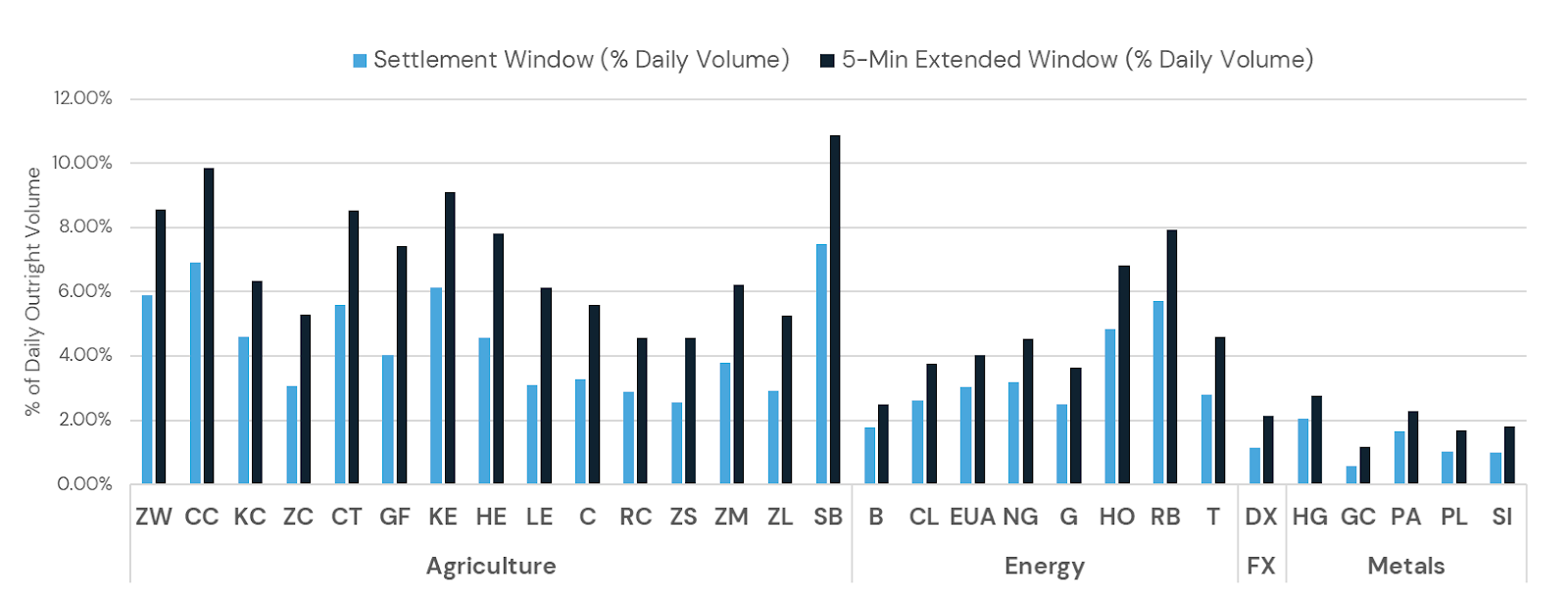 As shown in Figure 1 below, settlement window concentration (shown in blue) ranges from approximately 0.6% of daily volume (Gold, GC) to 7.9% (Sugar, SB). Including the five minutes preceding the settlement window (shown in navy) extends the window’s concentration to between 1.3% and 11.4% of daily volume. Every contract in Figure 1 shows a substantial increase in volume from extending the window, suggesting that a meaningful share of settlement-targeting flow begins accumulating before the formal window opens. For some contracts, volume is doubled (or nearly doubled), including Soy Bean Oil (ZL, an 83% increase), Feeder Cattle (GF, 84%), London Cocoa (C, 85%), Live Cattle (LE, 94%), Soybeans (ZS, 97%), and Gold (GC, 108%).