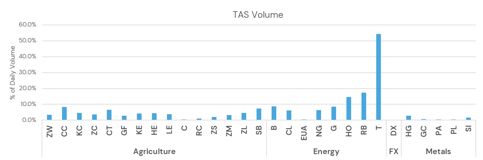 In this article, we analyze liquidity across 29 TAS-eligible contracts over a three-month period and uncover a key takeaway: for many products, the TAS market offers a significant liquidity pool compared to what the settlement window alone can provide.
